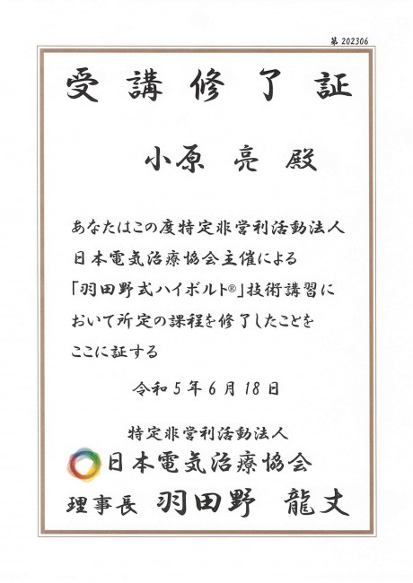 そしてこの日本電気治療協会 理事長 羽田野 龍丈先生から「羽田野式ハイボルト療法」を教わりました!